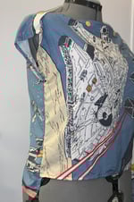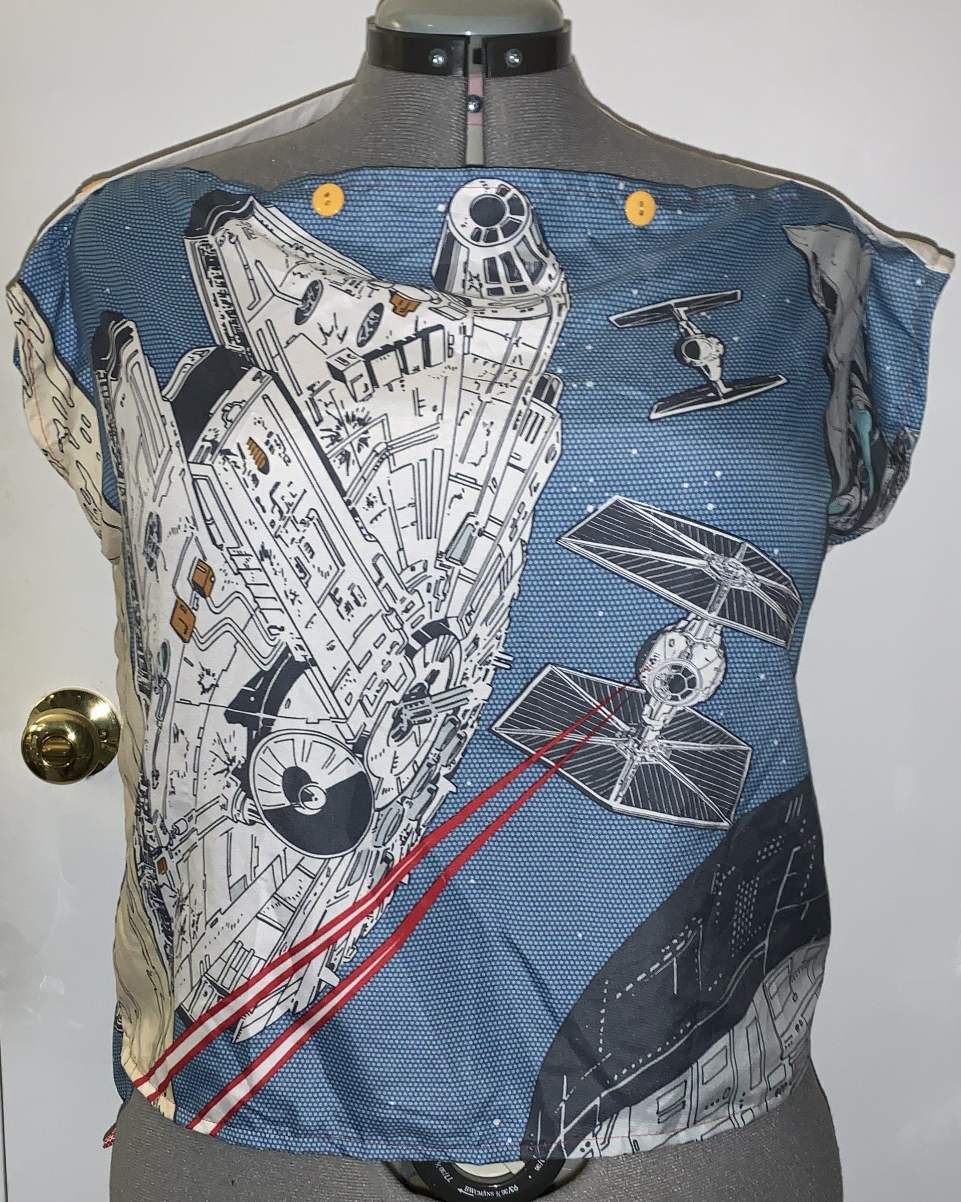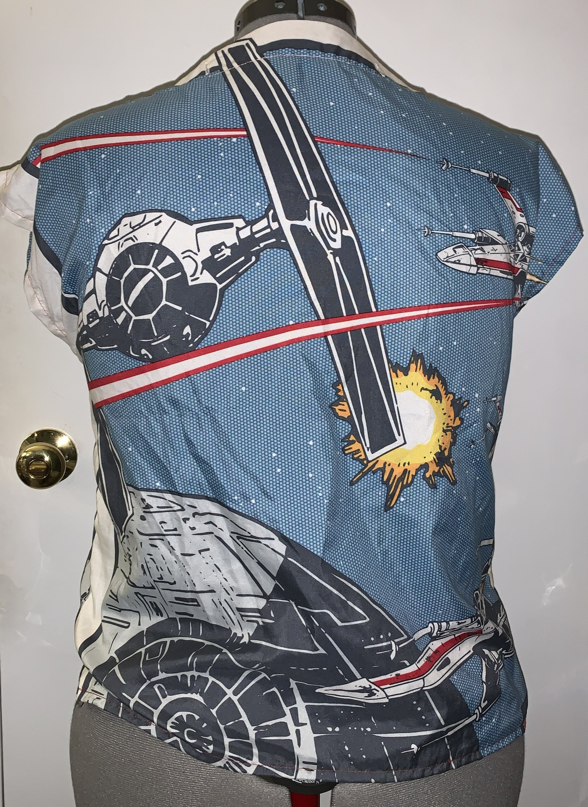 Star Wars shower curtain upcycled into a cute top. Cap sleeved top with slight high low hem. Boatneck with buttons for adjustment and decoration.