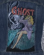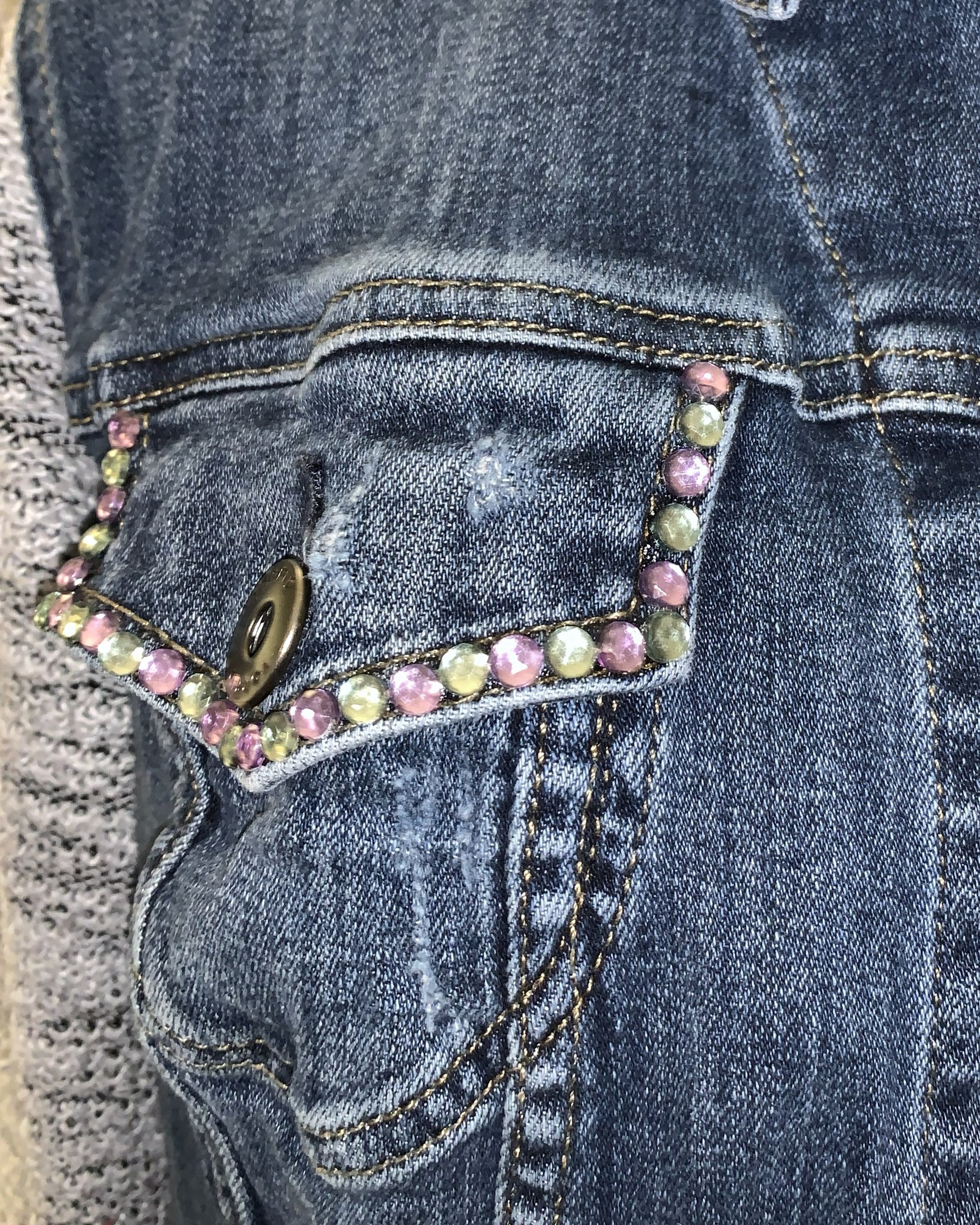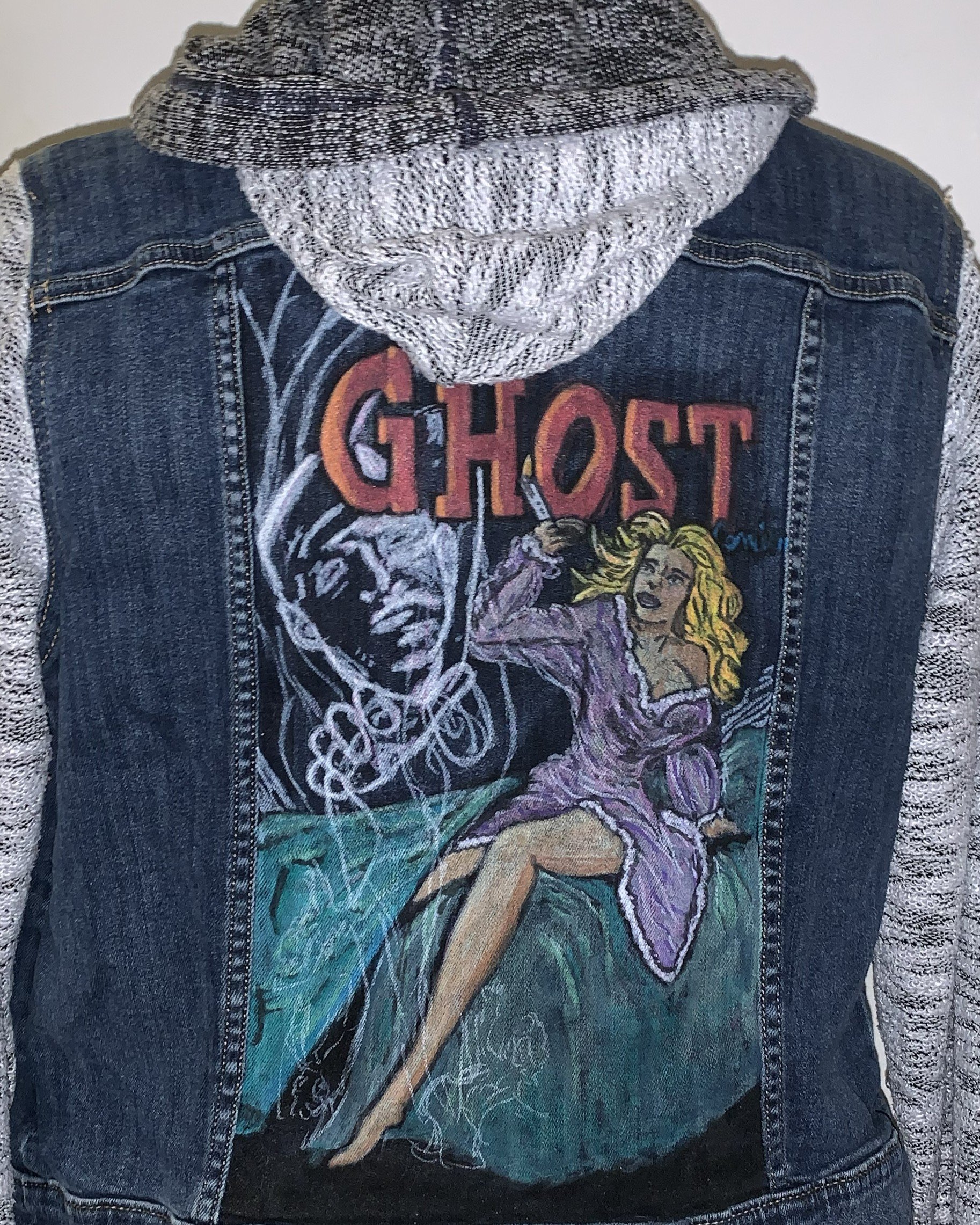 Previously owned hooded denim jacket in good condition then upcycled to with pulp comic painting on back and crystals on front pockets.
